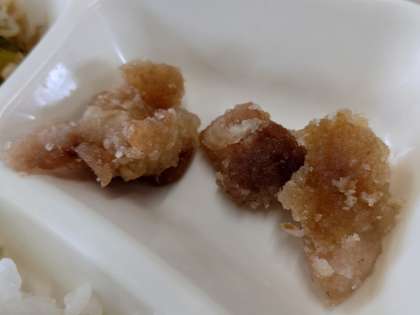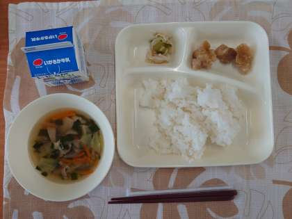 献立は、鶏肉のからあげ、中華スープ、チンゲンサイともやしの甘酢あえです。