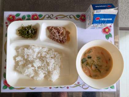 献立は、豚肉のしょうが焼き、みそ汁、じゃこピーマンです。