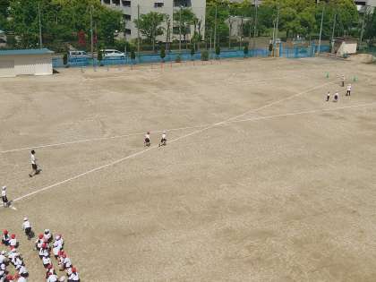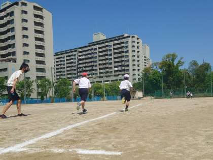 スポーツテストの測定が始まっています。今日は50m走を計測しました。ずっと向こうのゴールまで、全力で走ります!