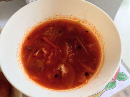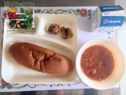 ミネストローネは、イタリア語で具が多い、ごちゃ混ぜという意味があります。トマトを使った野菜スープで、使う野菜も季節によって違うイタリアの家庭料理です。今日の給食では、鶏肉、キャベツ、玉ねぎ、トマト(缶)、にんじん、にんにく、パセリが入っています。野菜をたくさん食べられるスープです。