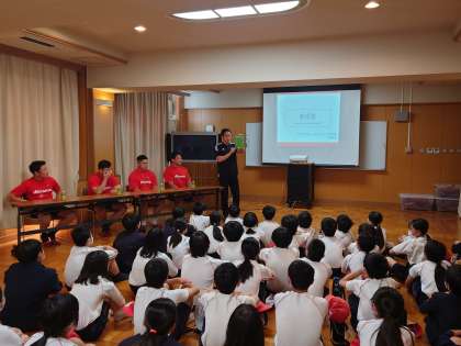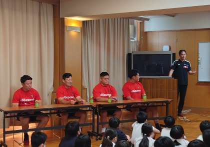 今日は、NTTドコモレッドハリケーンズ大阪の方々をお招きして、6年生が「夢・授業」を受けています。