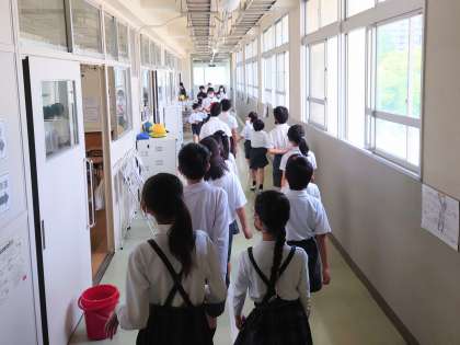 今日は、各班で集まって顔合わせや並び方の確認などを行いました。6年生がリーダーシップを発揮してがんばってくれています。