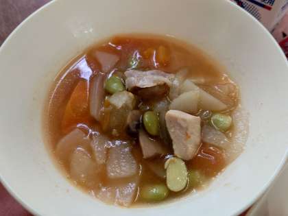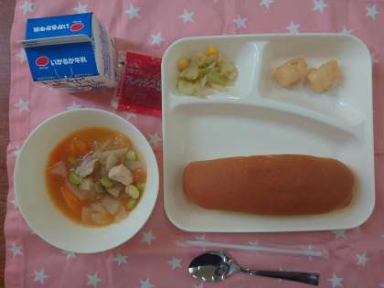 献立は、いかてんぷら、フレッシュトマトのスープ煮、キャベツとコーンのソテーです。