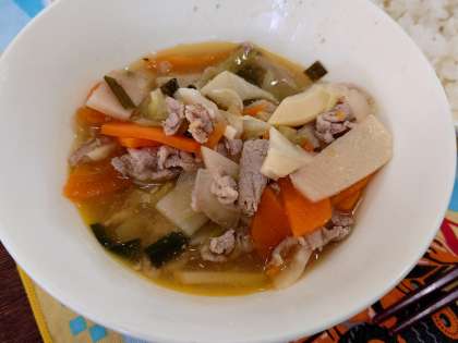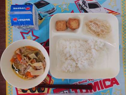 献立は、中華煮、あつあげのピリ辛じょうゆかけ、もやしの中華あえです。