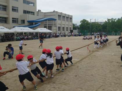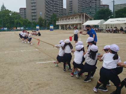 7・8年生の競技メンバーと小学校3・4年生全員が、綱引きで対決しました。