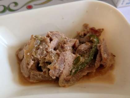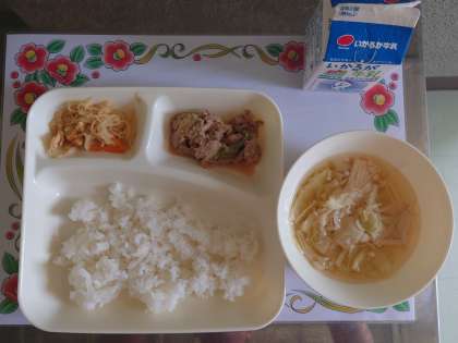 献立は、豚肉のごまみそ焼き、すまし汁、切干しだいこんのいため煮です。