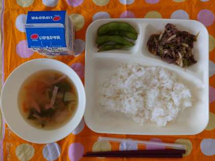 献立は、チンジャオニューロウスー、ハムと野菜の中華スープ、えだまめです。