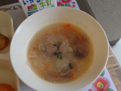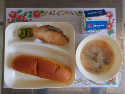 献立は、サーモンフライ、豆乳スープ、きゅうりのバジル風味サラダです。