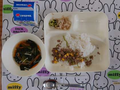 3つの色にこだわったメニューが並びます。今日の献立は、「令和4年度学校給食献立コンクール」の最優秀献立です。