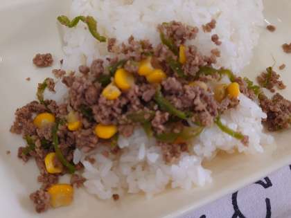 献立は、3色丼、3色スープ、3色酢のものです。