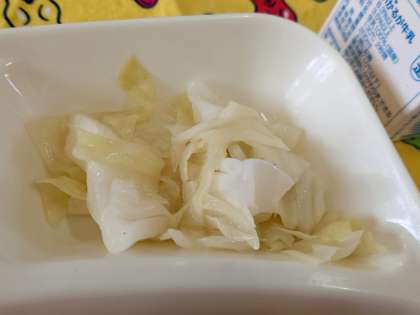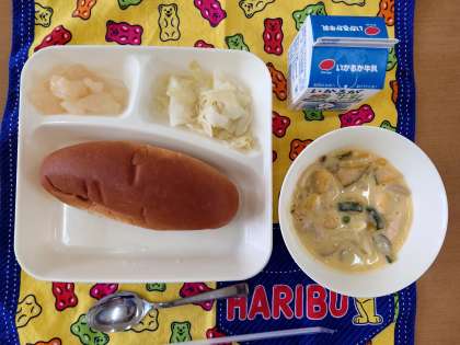 献立は、かぼちゃのクリームシチュー、キャベツのゆずドレッシング、和なし(カット缶)です。