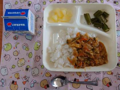 献立は、和風カレー丼、オクラのかつお梅風味、りんご(カット缶)です。