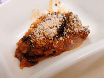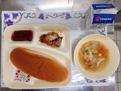 献立は、なすのミートグラタン、スープ、ダイスゼリー(ぶどう)です。