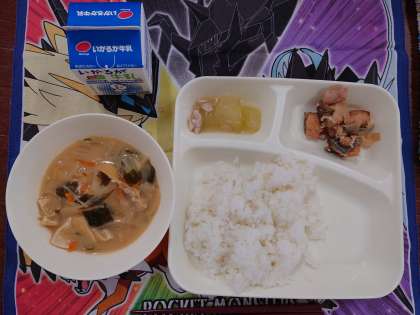 献立は、さけのつけ焼き、みそ汁、とうがんの煮ものです。