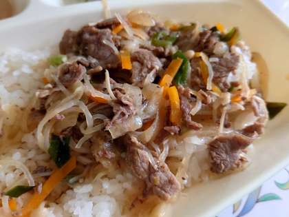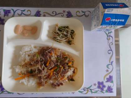 献立は、牛丼、もやしとピーマンのごまいため、大福豆の煮ものです。