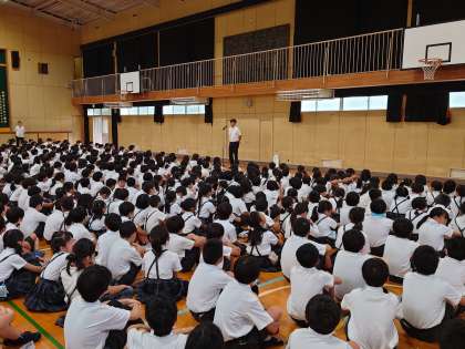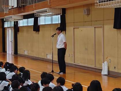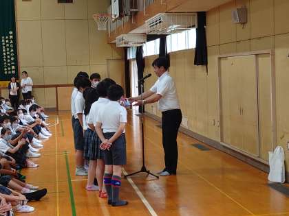 小学生のサッカーチームの表彰のあと、校長先生から夏休みを迎えるにあたり「熱中症に気をつけること」と「早寝・早起き・朝ごはん」のお話がありました。昨日の臨時休校で1日短くなってしまいましたが、明日から長い夏休みが始まります。安全・安心を第一に、楽しい毎日を過ごしてほしいと思います。