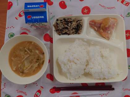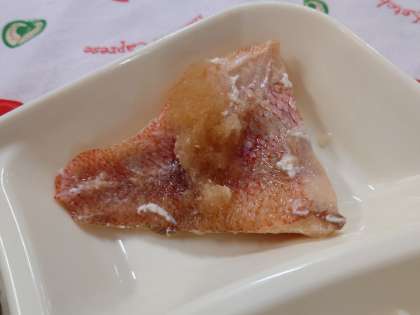 献立は、あかうおのおろしじょうゆかけ、みそ汁、高野どうふのいり煮です。