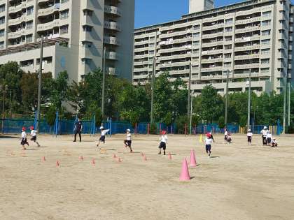 体育の授業で、かけっこ・走の運動遊びをしています。