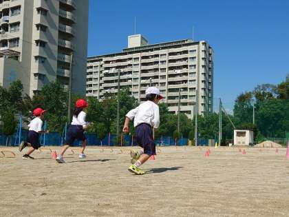 障害物を跳び越したり回ったりしながら走ります。みんな楽しみながら、ゴールまでダッシュしています!