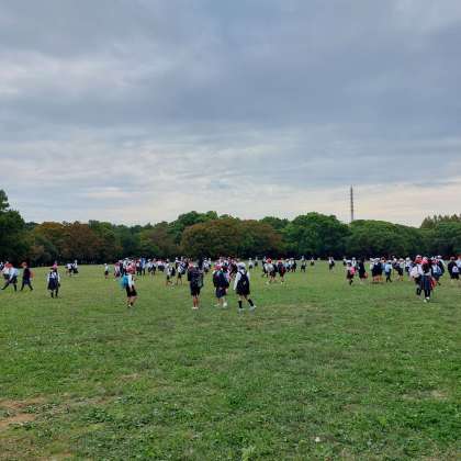 雨雲が広がってきたので、予定を変更して、今から全校児童一緒に学校に戻ります。