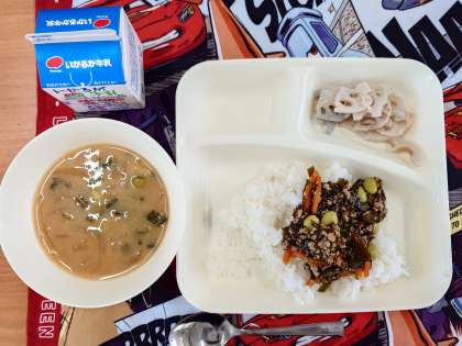 献立は、もずくと豚ひき肉のジューシー、さつまいものみそ汁、焼きれんこんです。