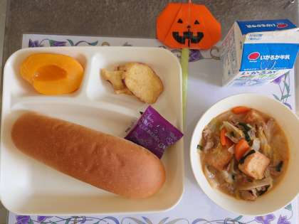 献立は、豚肉といかの中華煮、大学いも、黄桃(缶)です。
