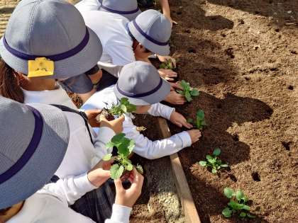 5年生が作ってくれた花だんに、1年生がお花を植えました。