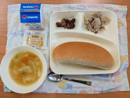 献立は、豚肉のバジル焼き、スープ、うずら豆のグラッセです。