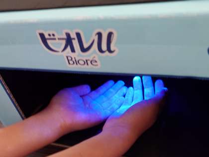 汚れに見立てた特殊なクリームを手に塗り、手洗いをしたあとの洗い残しをブラックライトで確認します。しわの間や爪の周りなどに洗い残しが。手洗いの大切さと正しい洗い方を学習しました。