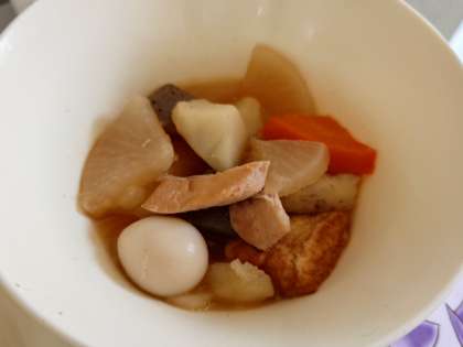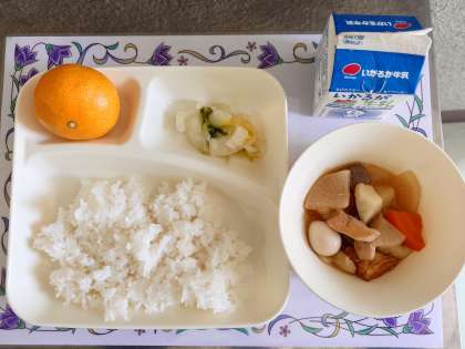 献立は、関東煮、はくさいの甘酢あえ、みかんです。