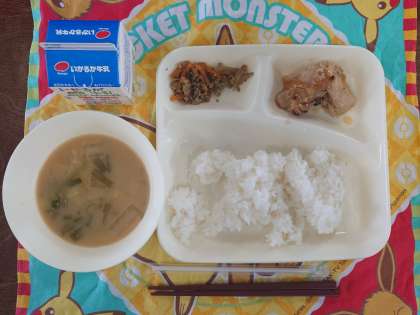 献立は、体ポカポカ鶏肉のしょうが焼き、ほくほくさつまいもみそ汁、ピリッとひき肉きんぴらごぼうです。