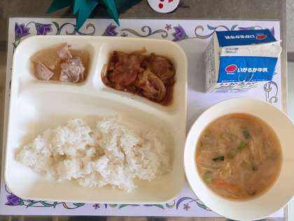 献立は、鶏肉の甘辛焼き、みそ汁、だいこんの煮ものです。