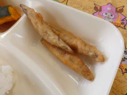 献立は、きびなごてんぷら、含め?、焼きかぼちゃの甘みつかけです。