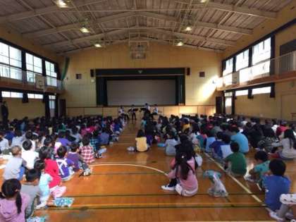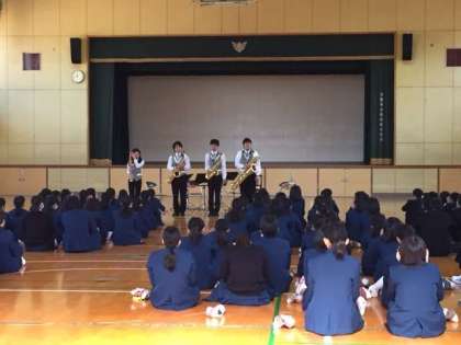 大阪市音楽団の「なぎさサクソフォンカルテット」の演奏を緑小学校と渚小学校の第1部、第2部を中学校が中学校の体育館で鑑賞しました。