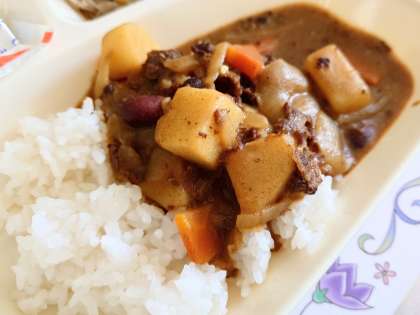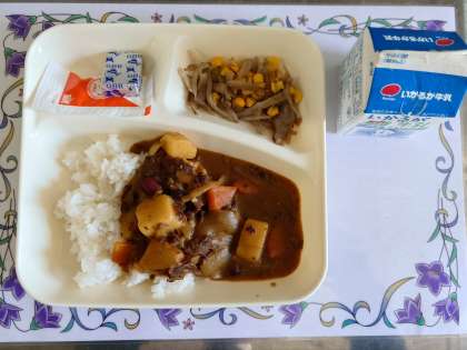 献立は、牛肉と金時豆のカレーライス、ごぼうサラダ(ノンエッグドレッシング)、固形チーズです。
