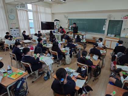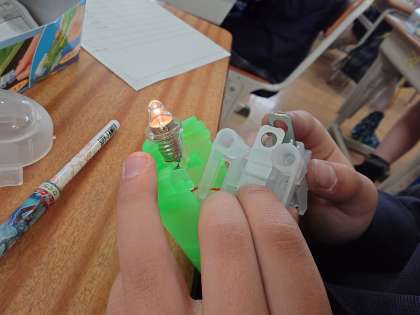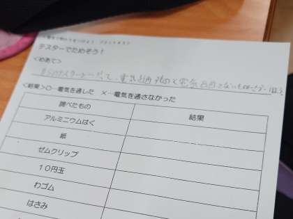豆電球と電池の回路を使って、電気を通すものと通さないものを調べます。