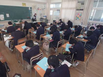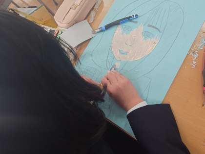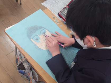 版画で自画像を彫っています。グッと正面を見据えた自分の顔をどんどん彫っていきます。ケガをしないように気を付けながら進めます。