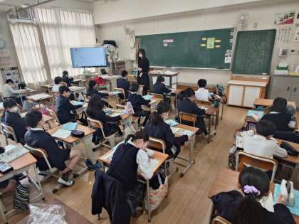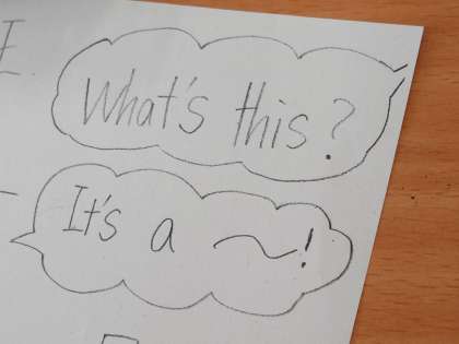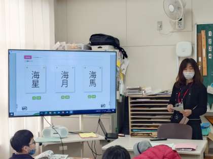 「What's this?」「It's a 〜.」のフレーズを学習しています。漢字クイズや足跡クイズで楽しみながら、繰り返し発音していきます。