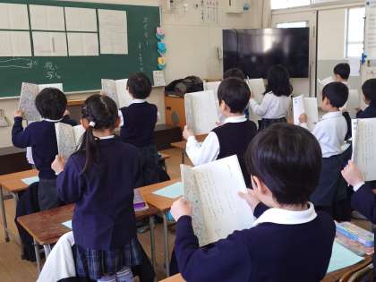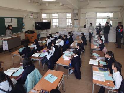 若手の教員を中心に、「はかせノート」を用いた物語の授業の進め方を、実際に先生の授業を参観しながら学びました。
