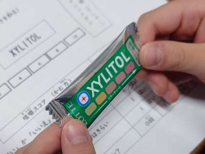 その後、咀嚼チェックガムとタブレットPCのカメラ機能を使って、自分の「噛む力」を調べました。