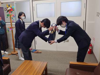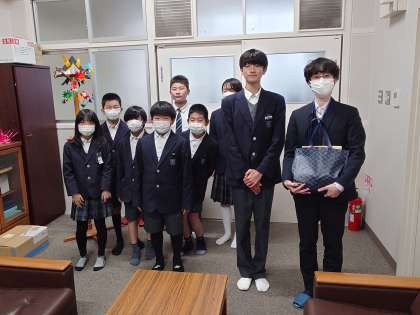 放課後、大阪府庁より大阪府危機管理室防災企画課の方にお越しいただき、児童会・生徒会のメンバーから義援金を手渡しました。