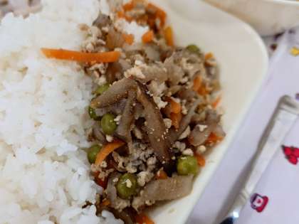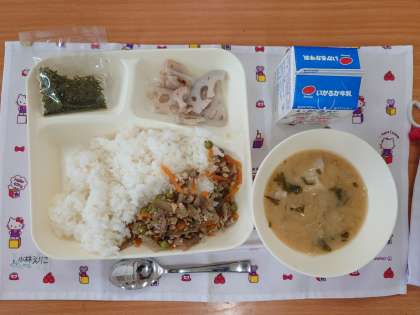 献立は、鶏ごぼうご飯、みそ汁、焼きれんこんです。