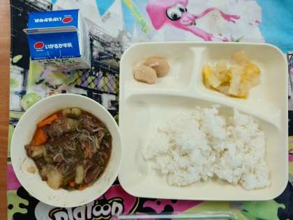 献立は、肉じゃが、はくさいのゆず風味、白花豆の煮ものです。