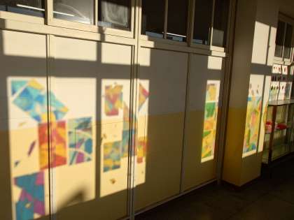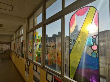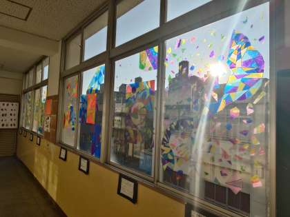 7年生の「校舎を彩ろう」という制作で、「自然」をテーマにグループで作り上げた光の作品です。本校は西陽が厳しいのですが、その西陽によって、一層美しい光の空間になっています。