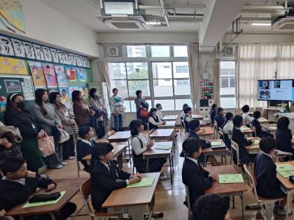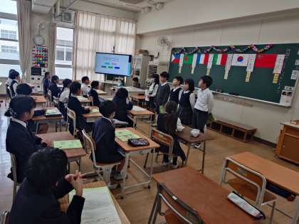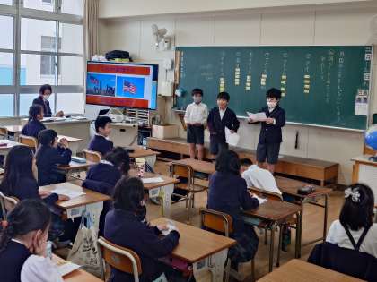 「外国のことをしょうかいしよう」で、各グループで調べた国々について発表します。たくさんの保護者の前で、みんな少し緊張気味ですが、がんばっています!