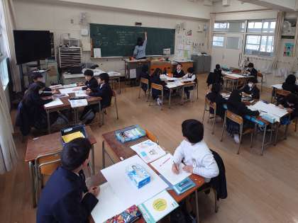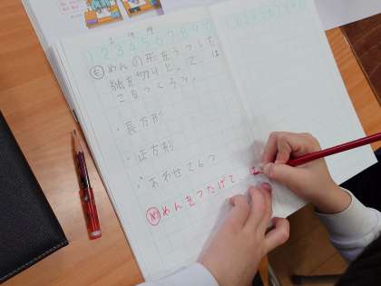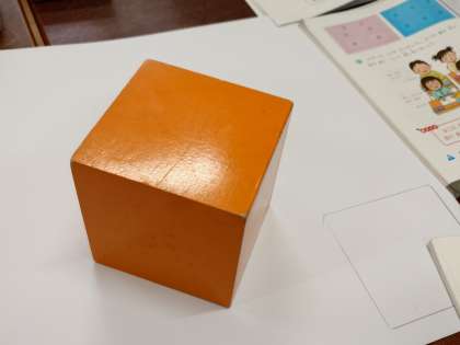 はこの形について調べています。正方形や長方形、どんな形ではこが出来ているか画用紙に写し取っています。グループで協力かて進めています。