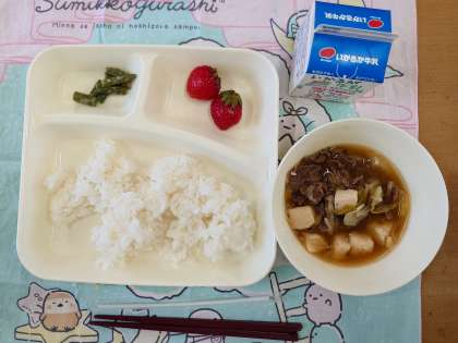 献立は、すき焼き煮、さんどまめのごまあえ、いちごです。