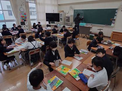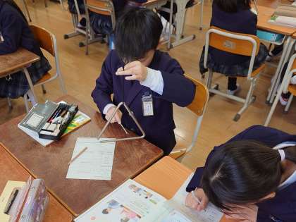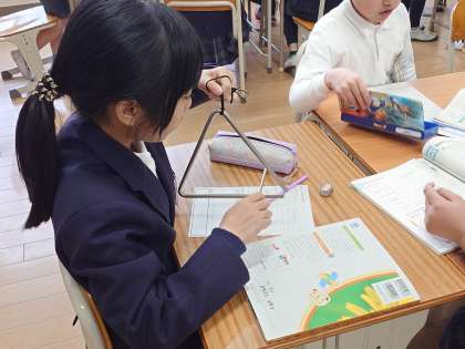 音が出ているものの様子を調べます。楽器のトライアングルを鳴らしながら、グループで確認しました。とても楽しい観察になりました。