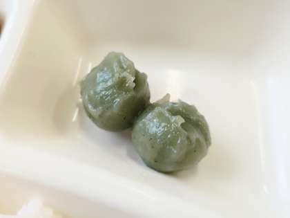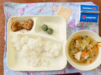 献立は、鶏肉のみそバターソース、五目汁、きな粉よもぎだんごです。