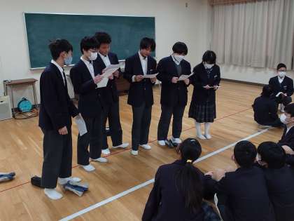 7年生が、卒業を控えた6年生に、中学校生活について実際に一年間を過ごした感想を伝えてくれました。